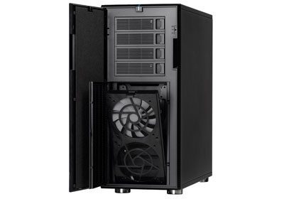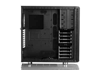 Le Define XL R2 est un boitier plus que complet avec une prise en charge des cartes mères XL-ATX, E-ATX, ATX, Micro ATX et Mini ITX, 2 cages amovibles à 4 plateaux pour disques durs, 9 slots d’extension PCI, le montage de l’alimentation en position basse, 7 emplacements pour ventilateurs (dont 3 inclus), un espace d’agencement des câbles et 4 baies 5.25″ en façade. Tout a été pensé pour faciliter l’intégration des composants et la maintenance du système. La cage HDD supérieure (4 plateaux au total) est rotative à 90 degrés et amovible pour une meilleure circulation de l’air ou pour accueillir une carte graphique mesurant jusqu’à 480 mm. Le châssis du boitier est plus large et permet une gestion des câbles optimale – cet espace est de 26mm. Concernant le watercooling, il est possible d’installer un radiateur slim de 280 mm ou de 240 mm lorsque les cages HDD sont repositionnées.