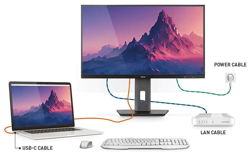La station d’accueil vous permet de connecter un ordinateur portable compatible avec un seul câble au moniteur pour vous assurer qu’il est à la fois chargé et connecté à un réseau câblé et que le signal de l’ordinateur portable est envoyé au moniteur. Avec des ports USB supplémentaires, votre souris, clavier ou webcam peuvent également être connectés au moniteur. Tout cela grâce à un seul câble reliant votre ordinateur portable à la station d’accueil USB-C sur le moniteur.