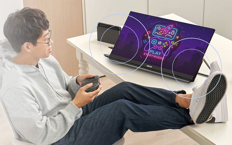Le ZenScreen MB249C est plus grand que la plupart des moniteurs portables : son écran FHD IPS sans cadre offre une diagonale visuelle de 24 pouces et des angles de vision larges de 178°. La dalle antireflet réduit les reflets et l’éblouissement, ce qui vous permet de travailler confortablement près d’une fenêtre ou de partager du contenu avec un groupe. De plus, deux haut-parleurs intégrés de 1 watt et un amplificateur délivrent un son convfortable, pour que vous puissiez profiter d’un son immersif lorsque vous regardez des vidéos, écoutez de la musique ou jouez à des jeux vidéo.