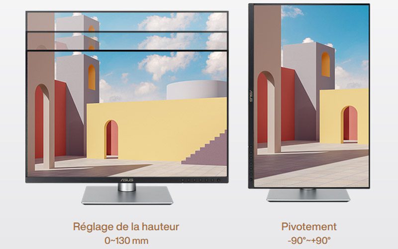 Chaque écran ProArt est équipé d’un pied ergonomique permettant de l’incliner, de le faire pivoter et de le régler en hauteur pour une visualisation confortable. La possibilité de faire pivoter l’écran de 90° dans le sens des aiguilles d’une montre ou dans le sens inverse pour l’utiliser en mode portrait se révèle très pratique pour travailler sur de longs documents, coder ou naviguer sur le web. De plus, la fonction de fixation rapide facilite le montage de l’écran via le support mural VESA intégré, le tout sans vis, en quelques secondes !
