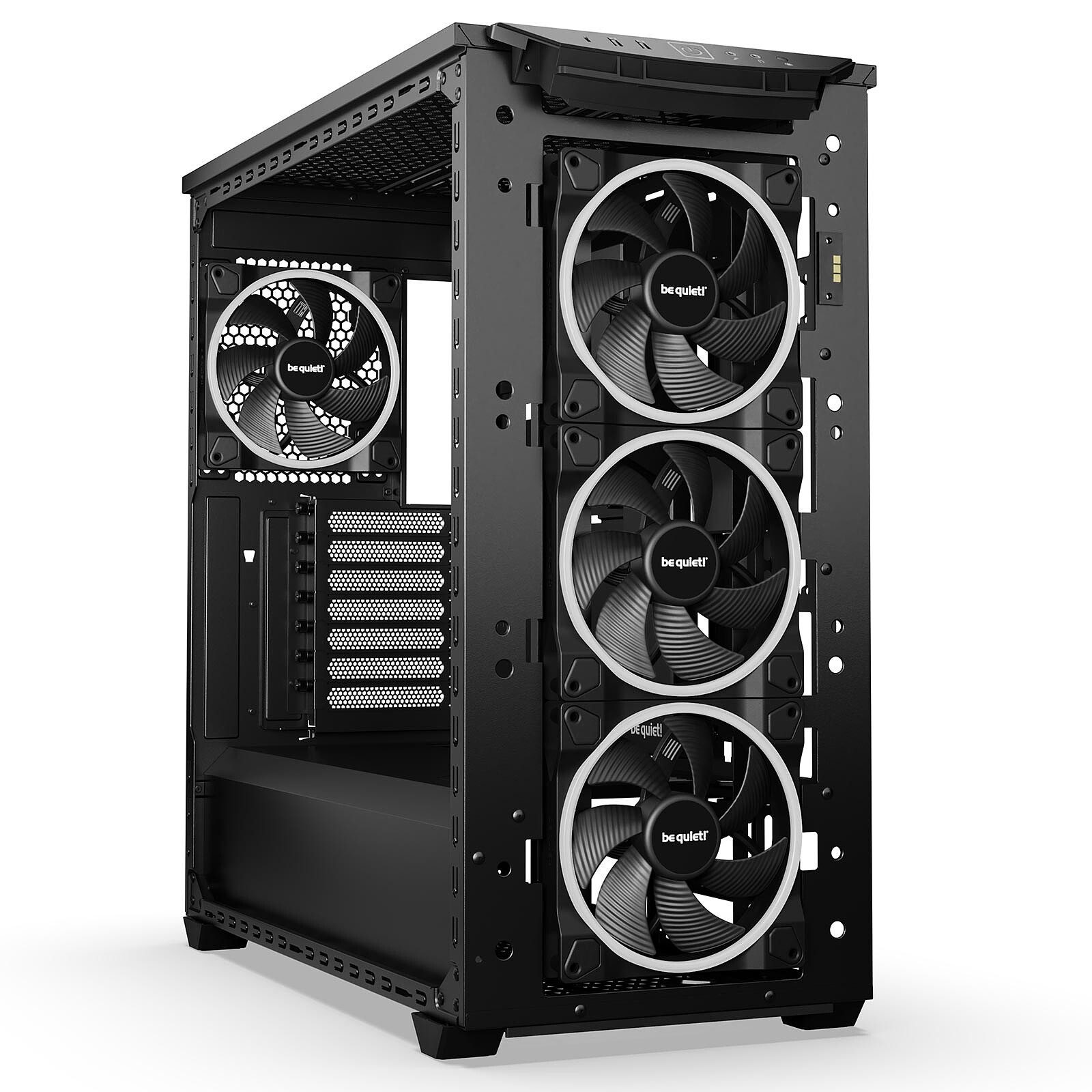Le be quiet! Shadow Base 800 FX est un boîtier grand tour optimisé pour un flux d’air efficace tout en offrant un fonctionnement silencieux et en proposant un éclairage ARGB en façade et via 4 ventilateurs Light Wings. Le Shadow Base 800 FX de be quiet! propose suffisamment d’espace intérieur pour accueillir les composants les plus imposants comme les cartes graphiques jusqu’à 430 mm de longueur ainsi que les cartes mères jusqu’au format E-ATX. Côté refroidissement, 4 ventilateurs Light Wings 140 mm sont préinstallés et le boitier peut accueillir des watercooling de 420 mm en façade et sur le dessus.