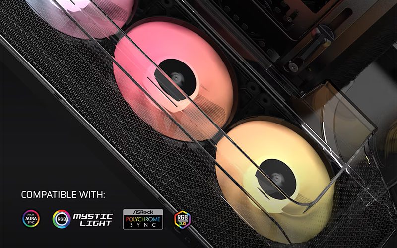 Les ventilateurs RS-R ARGB 120 mm à rotor inversé préinstallés dans la partie inférieure du châssis permettent un refroidissement puissant et silencieux avec un éclairage RGB magnifique et sans obstruction. Les ventilateurs peuvent être connectés en guirlande et branchés sur les connecteurs PWM et +5V RGB d’une carte mère pour un éclairage facile et un contrôle de la vitesse du ventilateur.