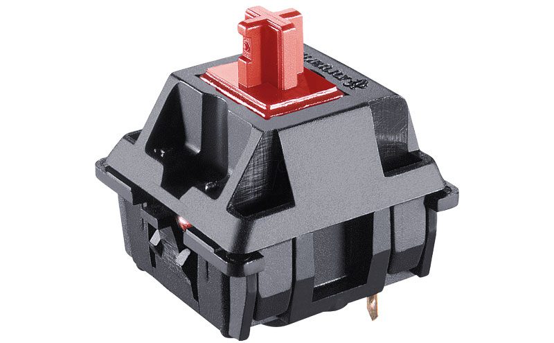 Les switches MX Red sont linéaires, donc sans retour audio et tactile. La pression requise pour activer l’interrupteur est en dessous de la moyenne, la frappe est rapide, précise et silencieuse : parfaite pour les personnes désirant silence et saisie sans fatigue.