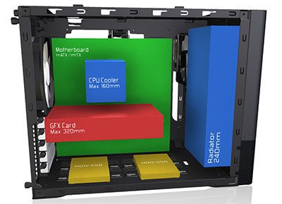 Le Fractal Design Node 804 prend en charge les cartes mères Micro ATX et Mini ITX afin de vous permettre d’assembler une configuration Gamer compacte et perfromante. Sa conception incroyable et son ergonomie sans faille vous autorisent à y installer le matériel le plus performant : Carte graphique jusqu’à 320 mm (290 mm max. avec ventilateurs installés à l’avant), système de refroidissement processeur jusqu’à 160 mm de hauteur, jusqu’à 8 disques durs 3.5” ou encore jusqu’à 4 SSD 2.5“. Compatible avec les systèmes de watercooling les plus évolués ou encore les watercooling processeurs tout-en-un, le Fractal Design Node 804 peut prendre en charge jusqu’à 4 radiateurs simultanément : 1x 240 mm + 1x 280 mm + 2x 120 mm.