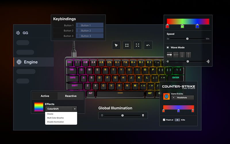 Il est temps pour vos logiciels et jeux préférés de rencontrer votre matériel SteelSeries. Grâce au logiciel de SteelSeries, vous prenez le contrôle de votre matériel et maitrisez vos performances en jeu. Paramétrez des effets d’éclairage dynamiques entre les appareils SteelSeries compatibles. Enfin, SteelSeries GG permet de créer de meilleures connexions avec votre matériel, vos coéquipiers et votre jeu.